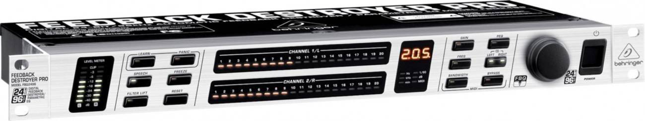 Behringer FBQ2496 – это самый быстрый (>0.2 sec.) и единственный подавитель обратной акустической связи, работающий на частоте 96 кГц. Используя сверхбыстрый алгоритм выявления обратной связи, устройство способно мгновенно определить до 20 проблемных частот в каждом канале и установить последовательность узкополосных режекторных фильтров, эффективно подавляющих обратную связь, оставляя полезный сигнал практически нетронутым.