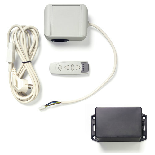 Радиочастотный пульт дистанционного управления (868,3 Мгц) с технологией Plug and Play. В комплект входит пятиканальный пульт-передатчик, приемник с технологией Plug and Play и белый кабель длиной 5 метров. Один такой пульт может управлять одновременно пятью экранами. Имеются комплекты с европейским, английским или швейцарским вариантом разъема.